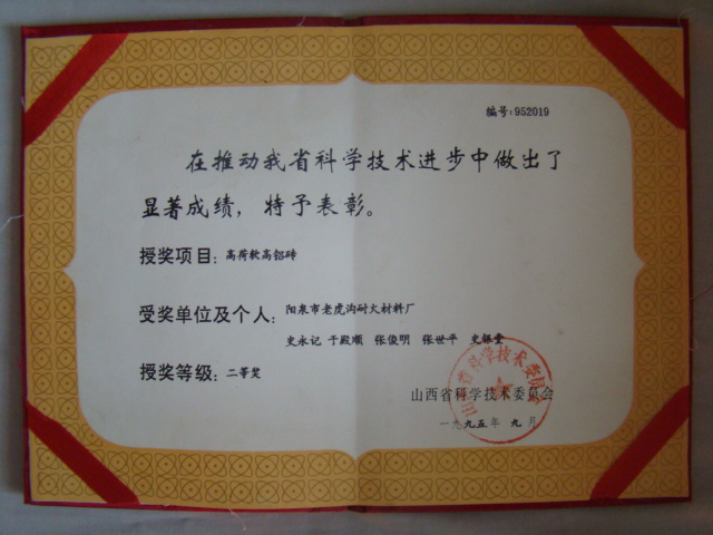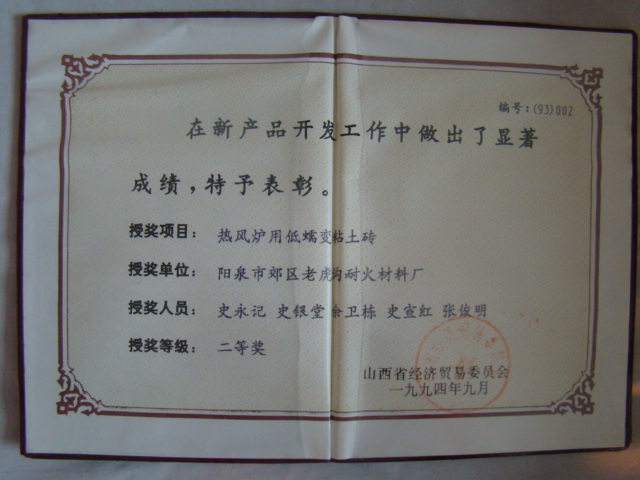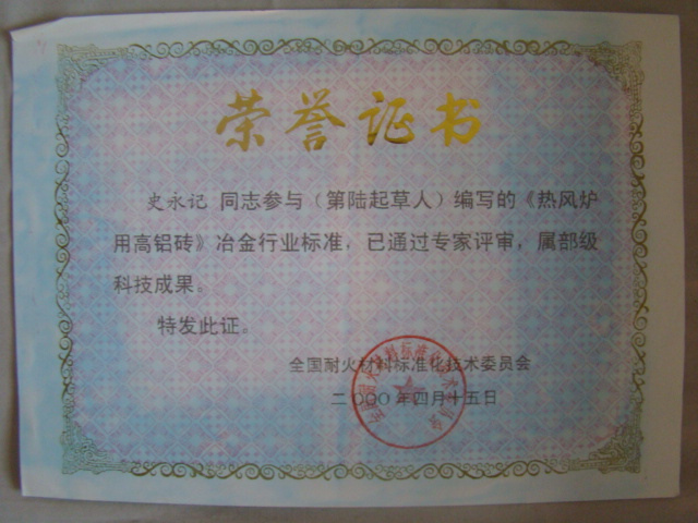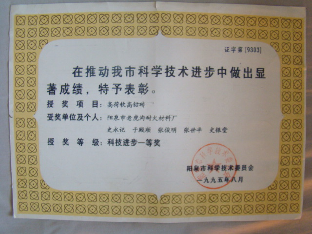 熱風(fēng)爐用低蠕變高鋁磚、高荷軟高鋁磚獲省科技進步二等獎,微膨脹高鋁磚列入火炬計劃項目,炭素焙燒爐用特種高鋁磚已批準國家專利